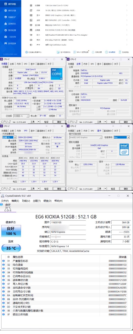 我手里这台戴尔15 DC15250的基本配置如下,CPU为第13代英特尔® 酷睿™ i5-1334U 处理器,2个性能核8个能效核,性能核最大睿频4.6Ghz,能效核最大睿频3.4Ghz;内置了一根16G的海力士DDR4 3200Mhz内存条(但是运行在2666Mhz),最高可以扩展到32G,硬盘为512G的铠侠EG6,这套配置在这个价位的轻薄本里是非常有性价比的一款机器了。